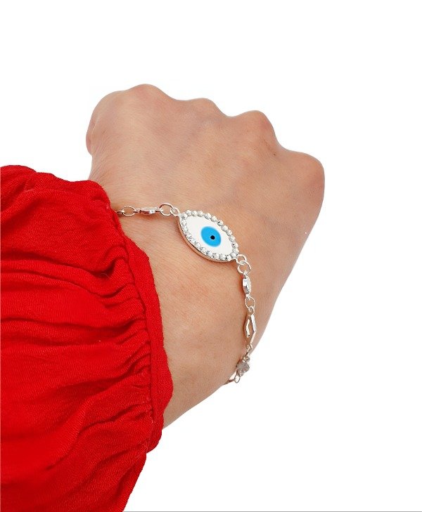 Pulsera Ojito Turco Celeste con cristales rodeandolo y cadena de rombos y redondeles .