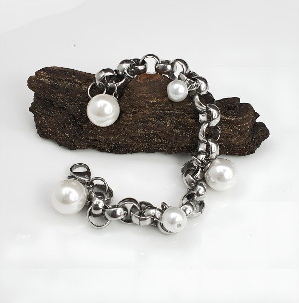 Pulsera Rolo de acero quirúrgico con Perlas de dos medidas ,10 mm y 06 mm .